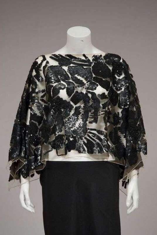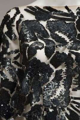 Dark gunmetal sequins forming a large abstract floral design densely applied to fine netting with occasional heavily beaded floral "bursts," with a boat neckline and otherwise open.