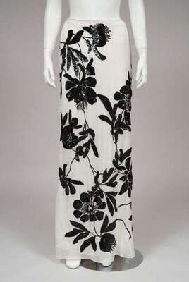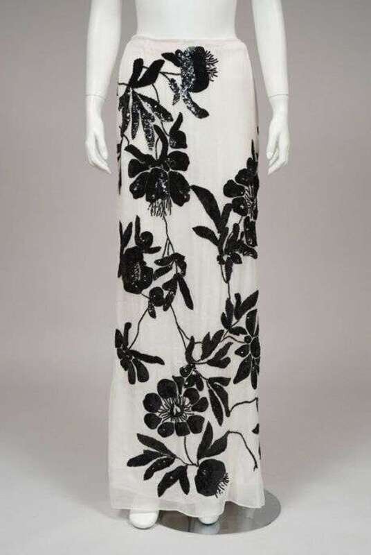 Floor-length white silk chiffon with large black sequined floral pattern.