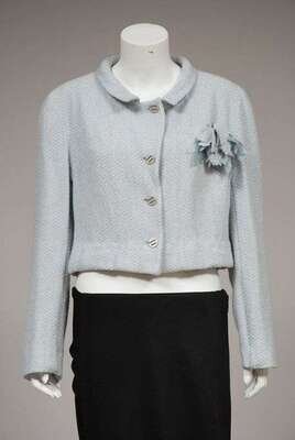 Baby blue and white tweed flecked with silver; with notch lapels, three button closure, with applied fabric flower. Size 46.