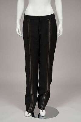 Heavy matte wool gabardine with flat waistband and zippers running down the center of each leg at the front; with kid leather back pockets. Size 46.