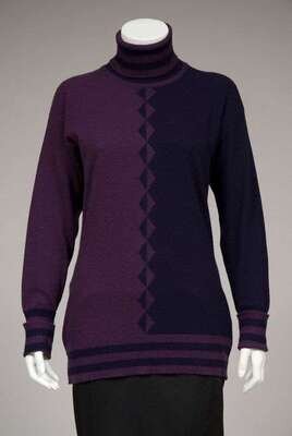 Consisting of an intarsia knit long sleeve turtleneck sweater and a deep V-neck cardigan with five gold buttons and pockets at the hips, thick ribbed edging. Size medium.