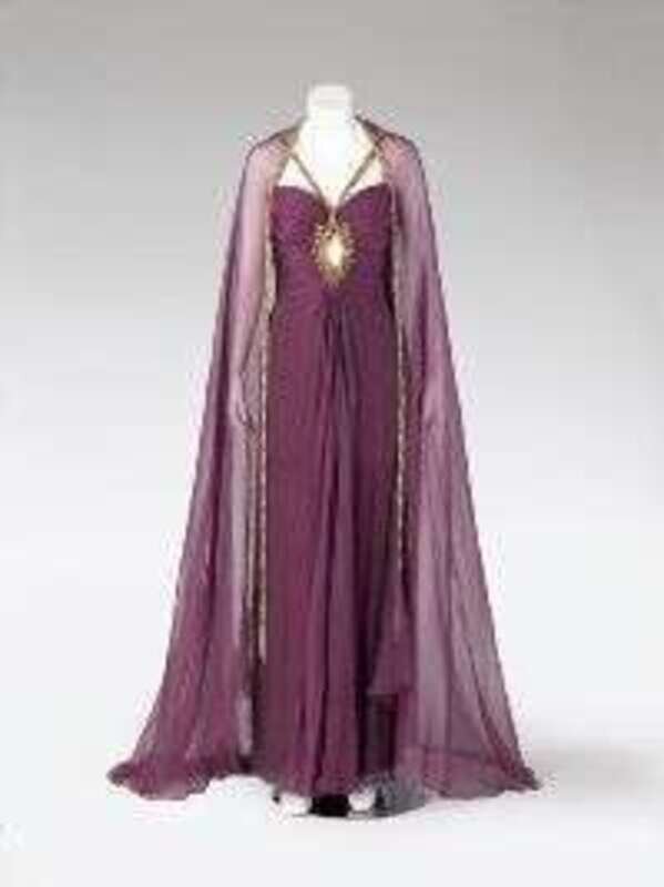 Iridescent violet crinkly chiffon with a shirred, shaped bodice embellished with a diamond key-hole cut out at the center below the bust, edged in gold and silver beading and rhinestones, the halter straps attaching at the top of the diamond; with a sheer chiffon wrap edged in the same beaded band design. Size 6/8.