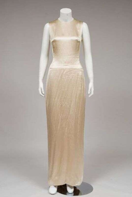 Sleeveless jewel-neck bodice with full-length straight skirt and a slight train. Size 4.