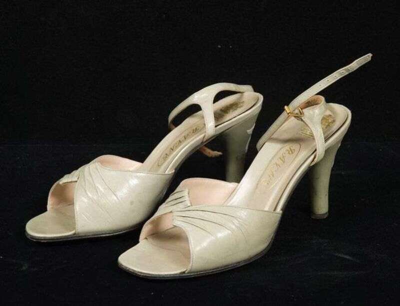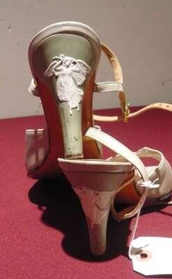 Sage green open-toe ankle-strap shoes with Jasperware Wedgwood heel depicting a winged Greek female figure.