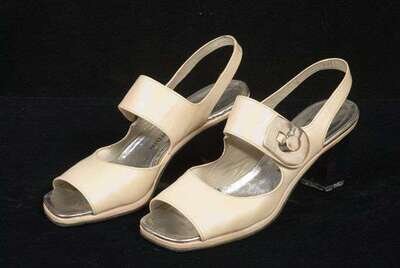Cream leather sandals with mirrored silver heels and chrome "key hole" detail at the sides, size 6 1/2. With original box and receipt from May, 1970.