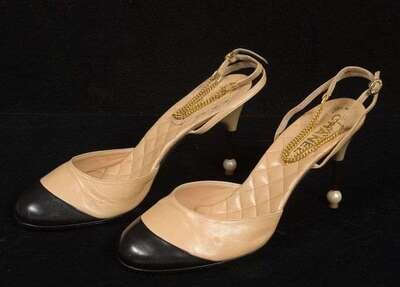Tan with black tips on the round toes, with a high spike heel with gold and pearl detail, gold chain ankle straps. Size 39 1/2.