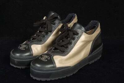 With white contrast stitching, stitched "CC" logo on the toes, "CHANEL" molded into the back of the thick lug heels. Size 40.