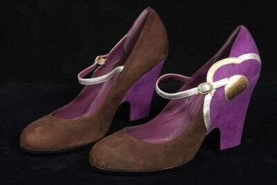 Brown and violet with metallic gold and silver flower design and a silver strap. Size 40.