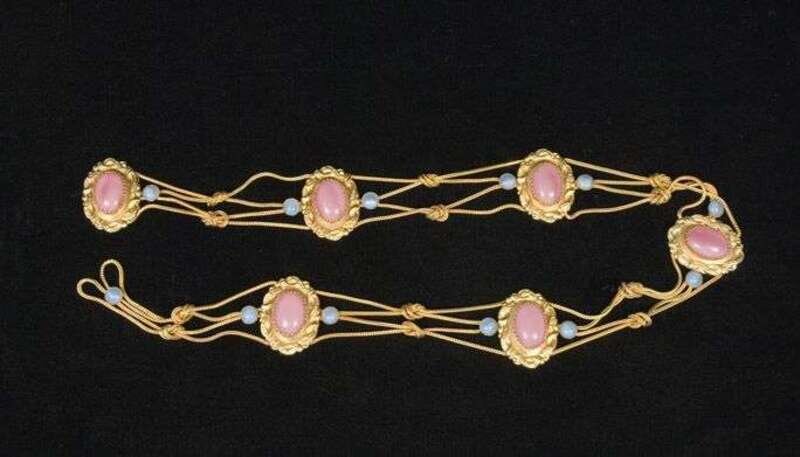 Baroque style oval plates with pink cabochons connected by snake chains decorated with pale blue smaller round cabochons.