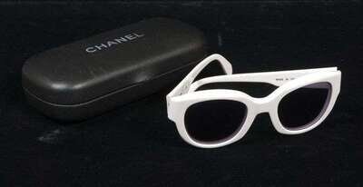 "Wayfarer" style white plastic frames, "CHANEL" in black letters on each side.