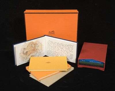 Two boxed sets of bound illustrations, four in each slip-cover. "La Mer," 1992; "Vive le Cheval," 1993; "Le Soleil," 1994; "La Route," 1995; "Vivre la France," 1989; "La Vie a l'air Libre," 1990; "Voyage en EXTREME-ORIENT," 1991; and "L'Exoticisme," 1988.