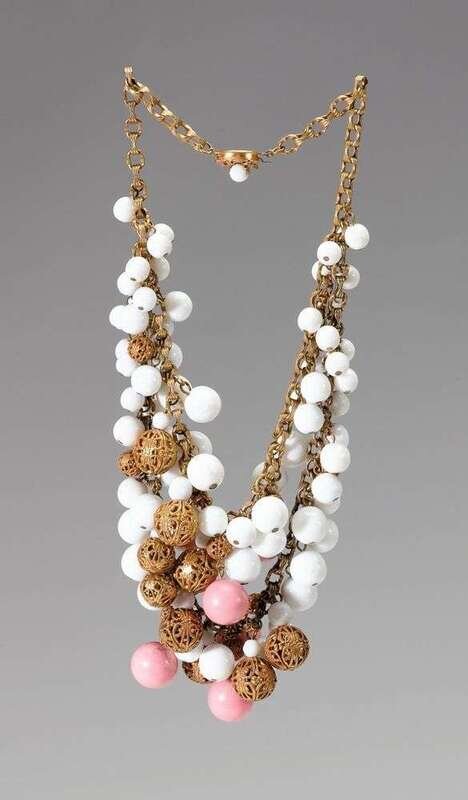 Double-strand of gold links with gold filigree, pink and white bead baubles.