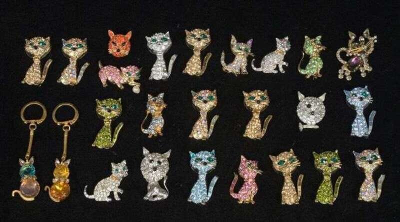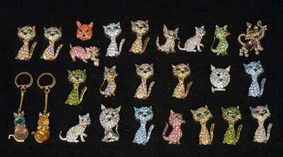 Large group of various rhinestone "cat" pins 1960s