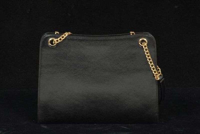 Black textured calfskin with two medium-length shoulder-straps with gold chain lower portions; interior framed section with gold latch. With original red Cartier lift-lid box.