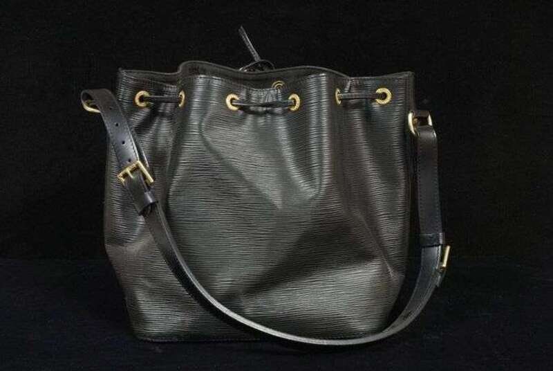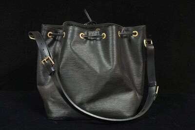 Black textured leather bucket-style purse with draw-string closure and adjustable strap.