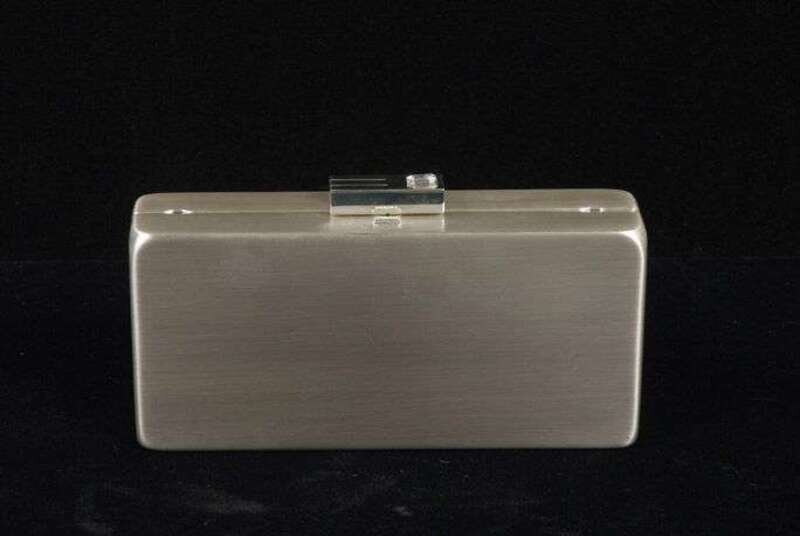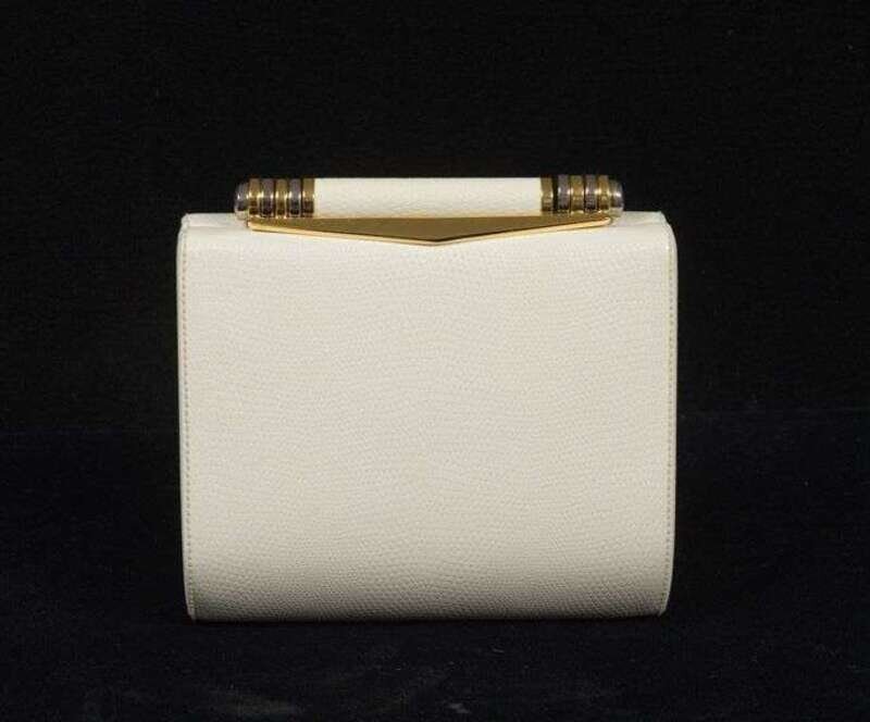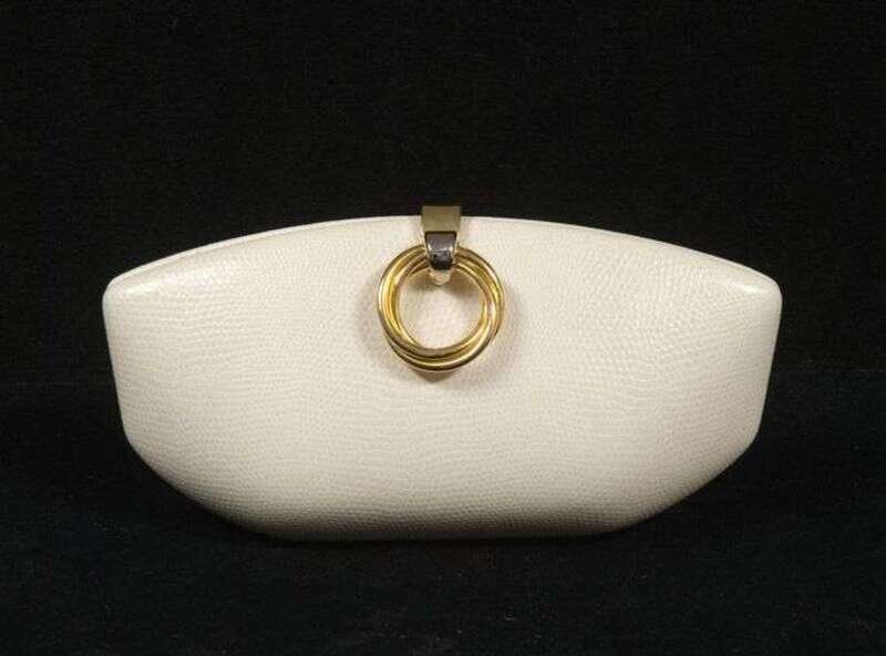 Two in cream reptile, one rectangular structured clutch with optional long strap with a gold and silver tone decorative latch and the other ovoid with an optional gold chain handle and roundel latch; the last a brushed silver rectangular clutch with jeweled latch, optional long silver chain handle.