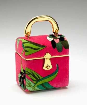 Miniature structured box-shaped purse with a lift-lid and gold latch and top handle, in bright pink velvet and multi-color foliate-print design, lined in green leather and embosses "Emilio Pucci" and "Italy" in gold.