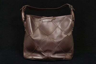 Large diamond-shaped patchwork pattern in heavy dark brown calfskin, with a short handle buckled at either side, magnetic closure, lined in cotton.