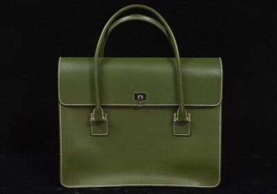 Avocado green double-handle bag with flap front, silver hardware, lined in pale green suede with multiple pockets.