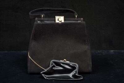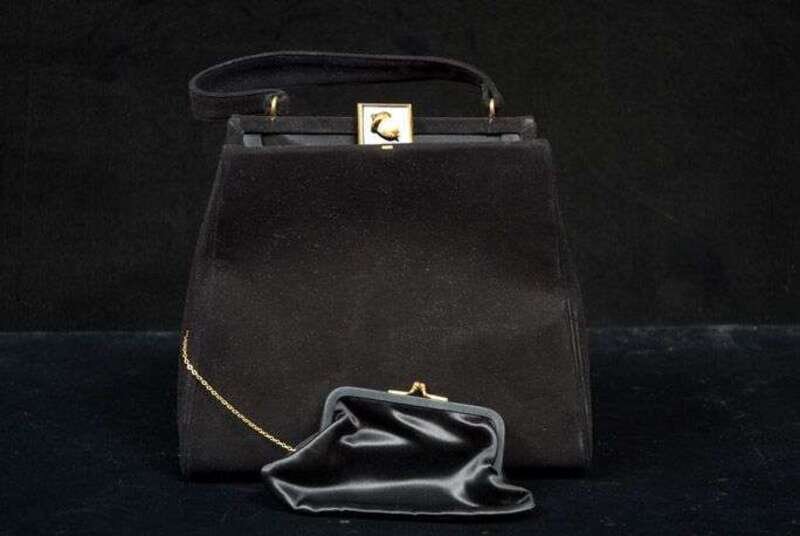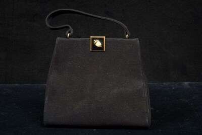 One by Koret and made of "Koretolope" with a gold and black enamel "acorn" detail clasp; the other by Lewis in woven textured stripes with a caramel lucite frame.