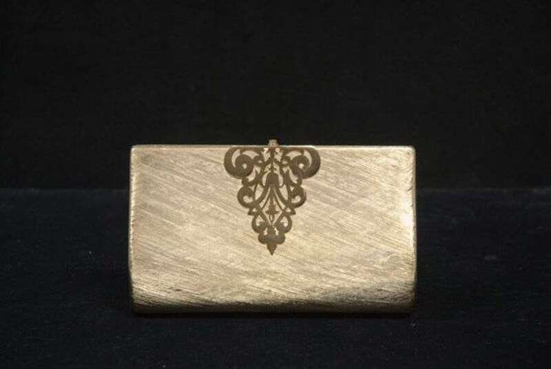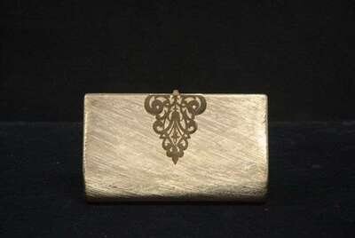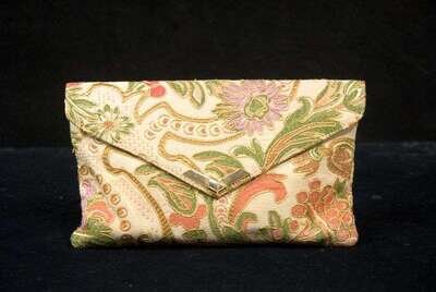 One in brushed gold with filigree detail; the other in floral tapestry. Both with optional chain straps.