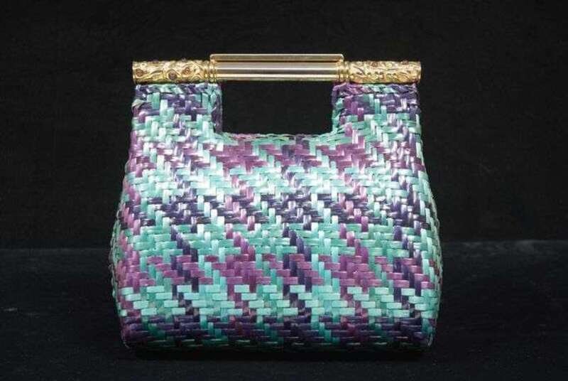 Brightly dyed basketweave structured bag in green and violet, with a gold and "amethyst" frame.