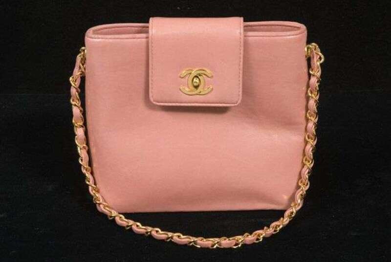 Rose-pink kidskin chain-handle purse with "CC" turn-lock closure.