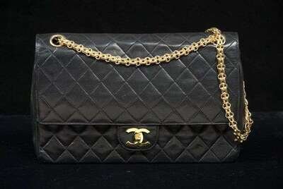 With "CC" logo turnlock closure and gold chain handle; double-flap closure and multiple interior pockets, with black and wine leather lining, exterior pocket verso.