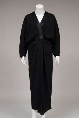 With cross-over V-neck neckline banded in satin, bat-wing split sleeves with buttons at the wrists, wrap-around closure with sculpted pleating and draping, dramatically bloused at the back waist. Labeled "Galanos" and "Nan Duskin." Size 2.