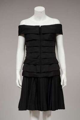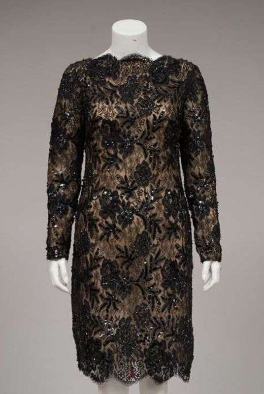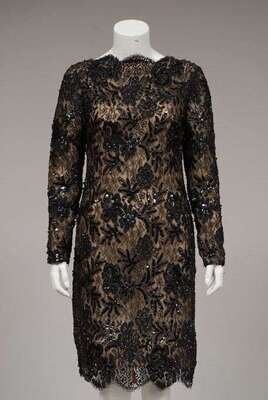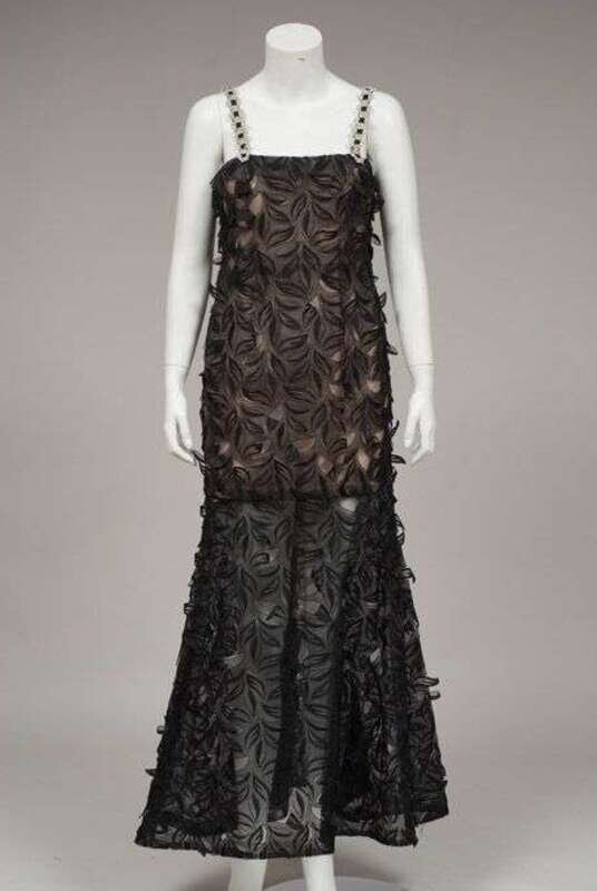 One long sleeve cocktail length in beaded lace over nude silk, with an A-line flare; one also cocktail length with boning and off-the-shoulder sleevelettes, criss-cross banded bodice and pleated skirt; the last ankle length in sheer cut-out embroidered leaf pattern charmeuse with rhinestone straps. Size 4/6.