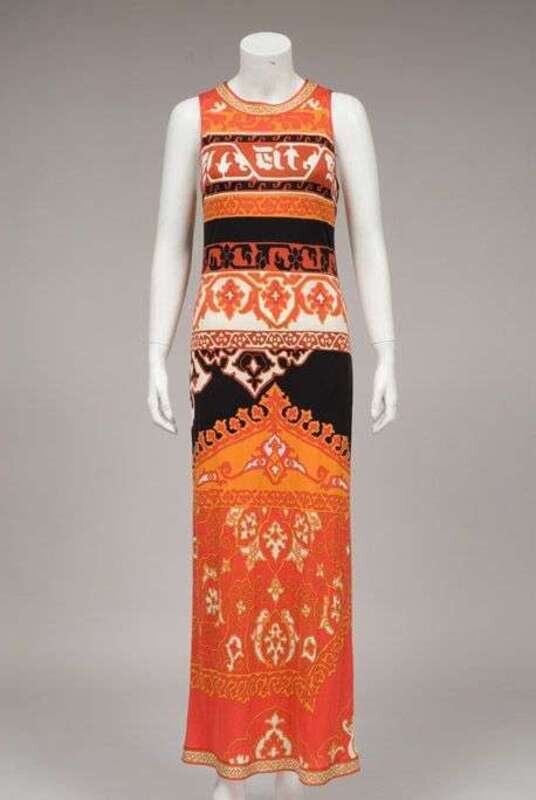 Red, orange, black, and bronze print on silk jersey, sleeveless and ankle length, size 8.