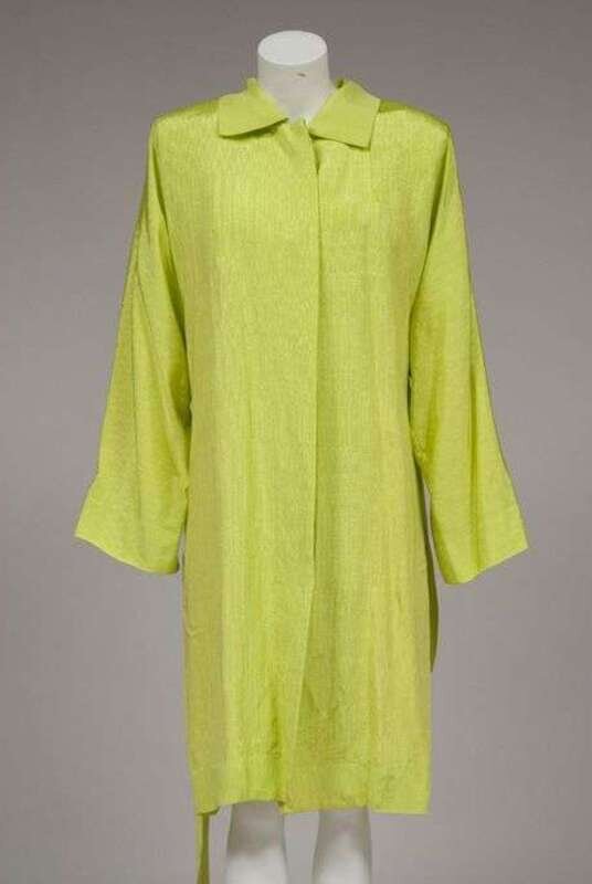 Bright shantung belted bat-wing coat with covered button placket, labeled "Yves Saint Laurent / Rive Gauche / etc." size 36.