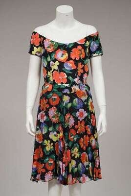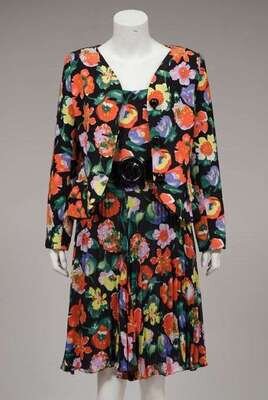 Bright floral watercolor print on black, the dress with a wide scoop neckline and short sleeves, knee-length loosely pleated skirt, with a matching fitted jacket with black buttons and a sweetheart neckline. Size 4/6.