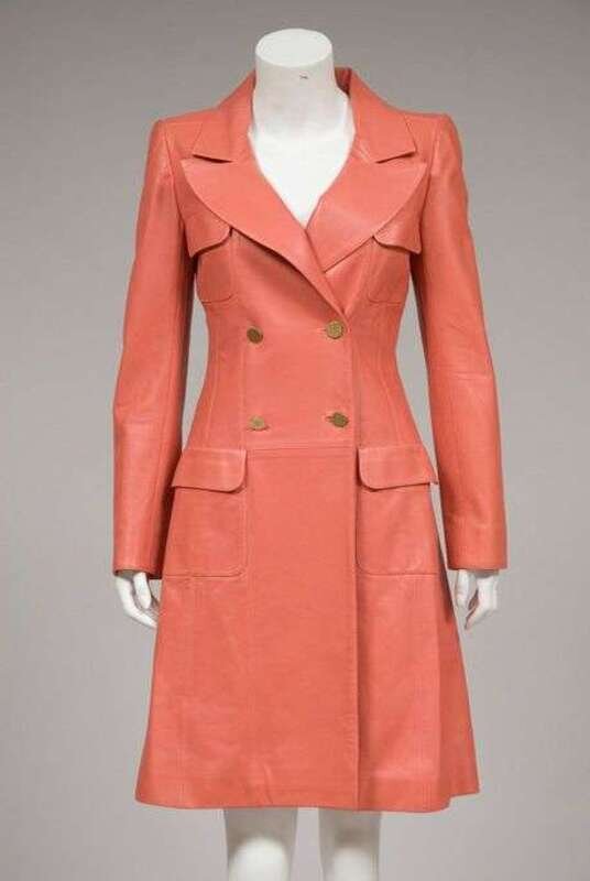 3/4-length peaked lapel long lambskin jacket with pockets at the hip and the breast, with brass "CC" logo buttons. Size 36.