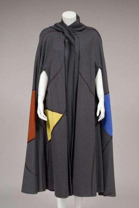 Voluminous gray heather jersey cape with an open abstract ribbon appliqué criss-cross pattern filled randomly with primary colored color blocks; attached jersey neck wrap, with arm openings. Unlined.