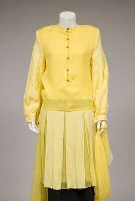 Long sleeve tea-length dress with diagonal pleats across the bodice and the sleeves, jewel neckline, back buttons, and an attached long wide sheer sash. Labeled "Galanos" and "Nan Duskin," size 6.