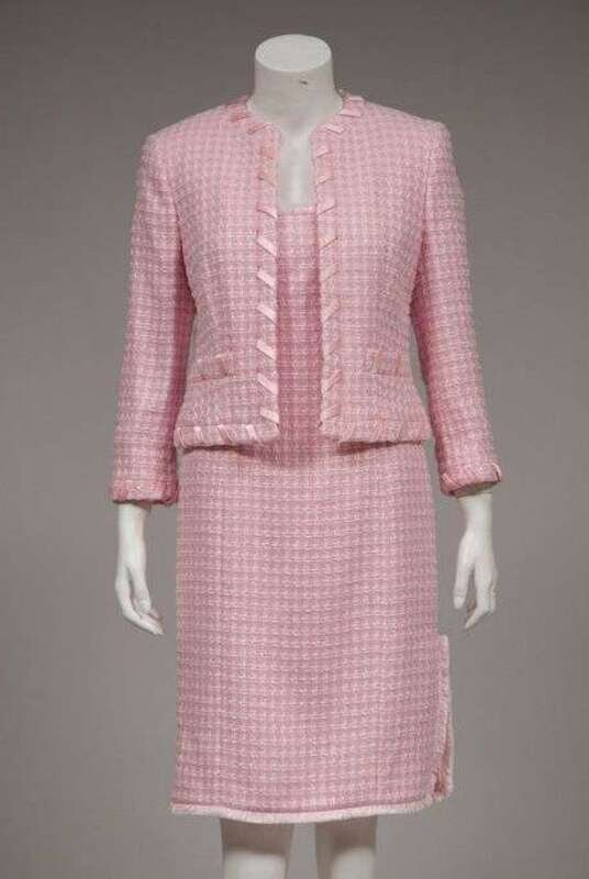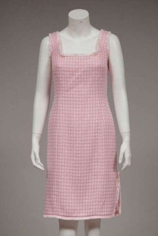 Tank style dress with fringed edging, with a matching open-front boxy jacket with pink satin whip-stitch edging. Size 34.