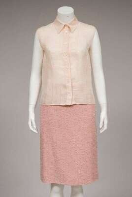 Open-front blazer trimmed with a ruffle with a matching A-line skirt with slanted hip pockets and small purse. Together with a pink linen Chanel Identification sleeveless blouse. Size 38.