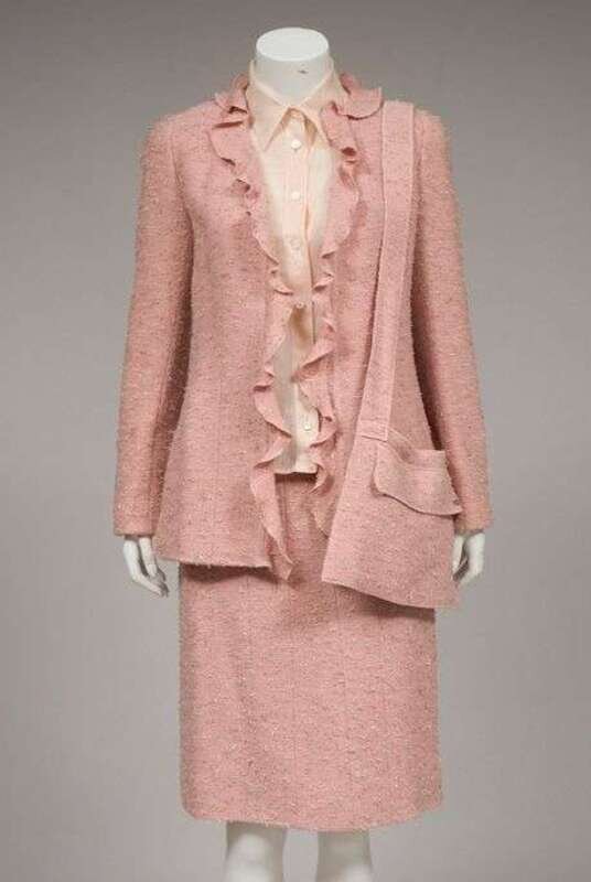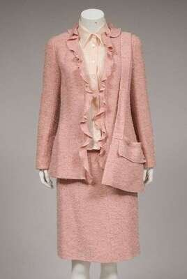 Pink tweed Chanel ruffled jacket and skirt fall 1999