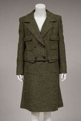 Dark green and black tweed wool slightly cropped double-breasted blazer with wide notch lapels and two flap pockets, the A-line skirt also with flap pockets, falling to below the knee. Size 40.