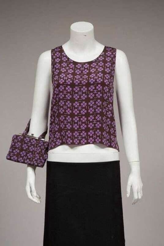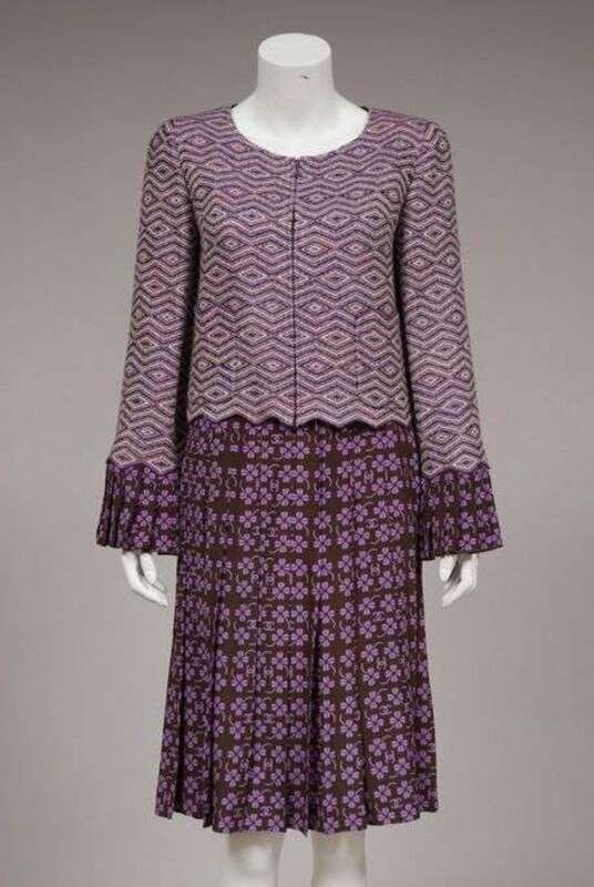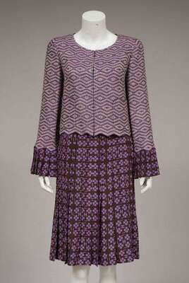 With a four-leaf-clover and "CC" motif in violet on brown, with a knife-pleated below-the-knee skirt and shell, and a zip-front woven diamond pattern jacket with pockets and pleated silk cuffs; also with a small matching purse. Size 36.