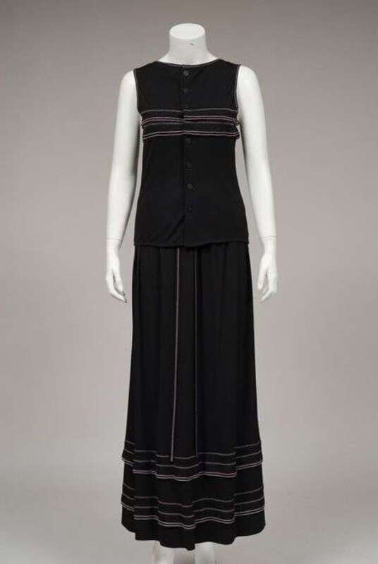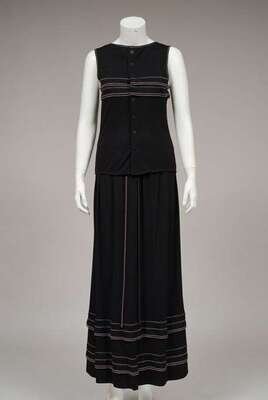 Sleeveless tank top with buttoning at the back and a long skirt with a tie at the waist, both with subtle ruffle and mauve contrast stitch details. Size 36.