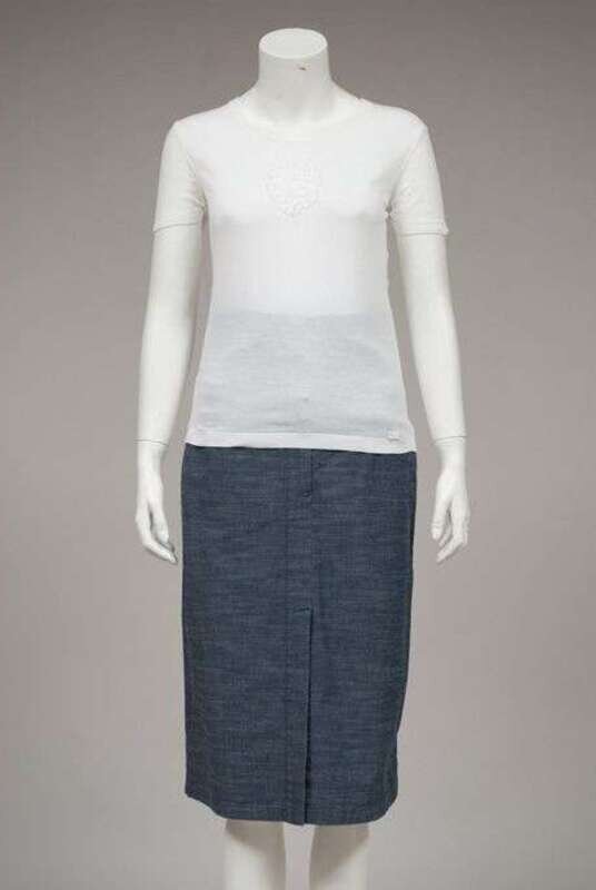 Bellow-the-knee denim skirt with a high waist with elastic shirred insets at the sides and a high, three-button waistband; and a fine cotton knot jersey short sleeve top with a ruched "flower" detail at the front. Size 38/40.