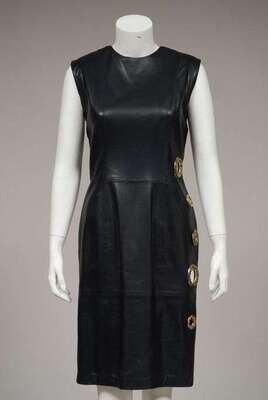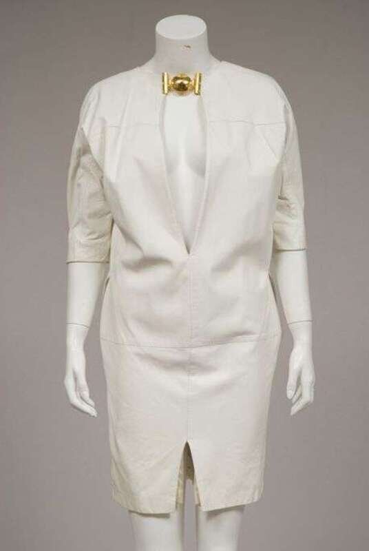 One in white, with a cocoon silhouette with elbow-length sleeves and a deep cut-out neckline and round gold buckle fastener at the neck; the other a sleeveless tailored shift in black kidskin with five oversized decorative gold grommets on the right side starting at the waist. Both made in Italy, labeled "Gianfranco Ferre" and "Nan Duskin," size 42.