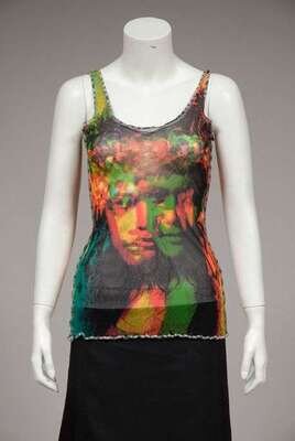 Including a matching long tube dress and tank top, a short sleeve shirt and matching long sleeve tie-front blouse, and a black skirt, all in stretch tulle.