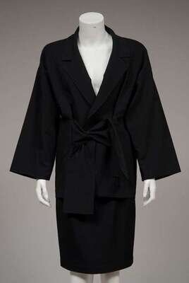 One a black loosely fitted notch lapeled blazer with a wide tie at the front; the other a sleeveless lemon yellow "sailor" dress with black button decoration and a long pleated skirt. Both size small.