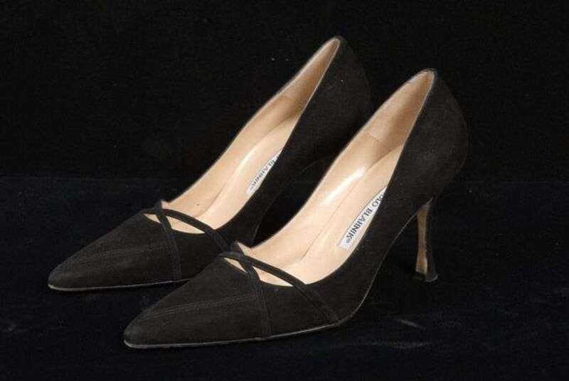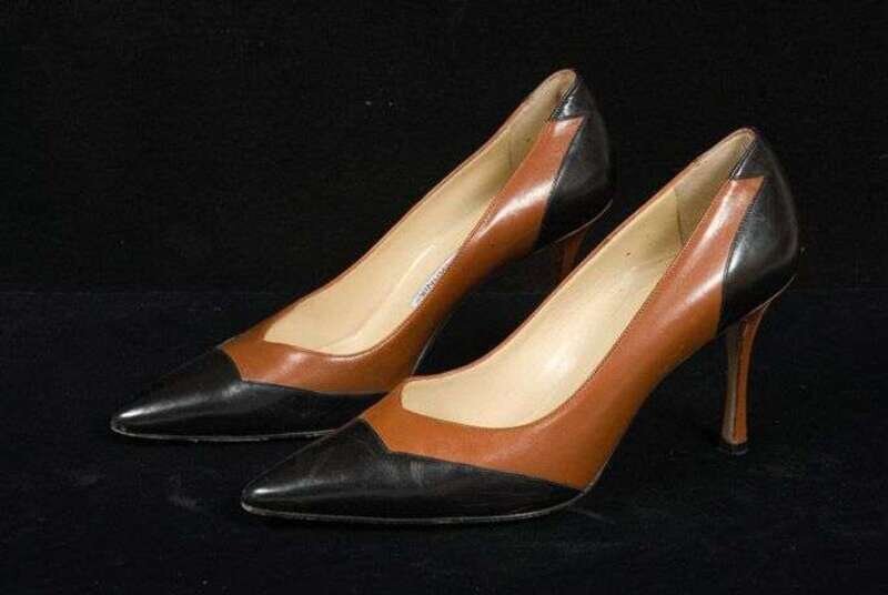 One in cognac and black leather and the other black suede, both with pointy tips and stiletto heels. Size 37 1/2.