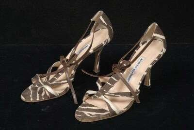 Brown and white zebra print strappy T-strap heels with leather ties, size 37 1/2.