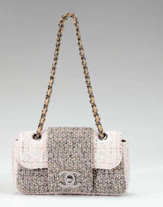 In classic Chanel suiting material in grays and pinks, with a large gunmetal chrome "CC" logo turnlock closure and chain and leather handle, lined in soft kidskin and loco jacquard.