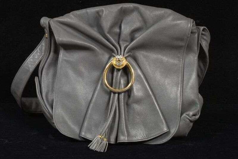 Grey supple leather shoulder bag with long strap; with a centrally gathered over-flap closure decorated with a leather cord-tie and dramatic gold loop and black and white enameled "wild cat" detail, with other small gold details, lined in pigskin and embossed "Gucci" in gold.